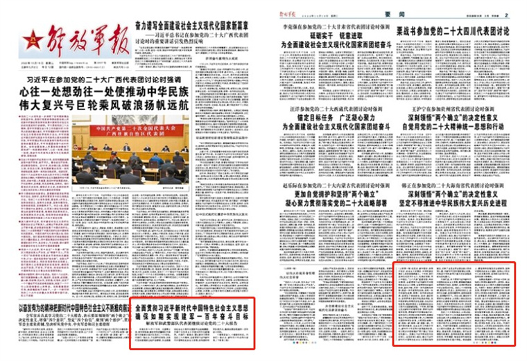 解放軍報(bào)北京10月17日電? 記者費(fèi)士廷、錢宗陽報(bào)道:解放軍和武警部隊(duì)代表團(tuán)今天繼續(xù)分組討論黨的二十大報(bào)告。代表們一致認(rèn)為,習(xí)主席作的報(bào)告,為我們黨治國理政立起行動綱領(lǐng),為全面建設(shè)社會主義現(xiàn)代化國家作出戰(zhàn)略擘畫,開辟了馬克思主義中國化時(shí)代化新境界。代表們一致表示,要認(rèn)真學(xué)習(xí)貫徹黨的二十大精神,全面貫徹習(xí)近平新時(shí)代中國特色社會主義思想,加快國防和軍隊(duì)現(xiàn)代化,確保如期實(shí)現(xiàn)建軍一百年奮斗目標(biāo)。