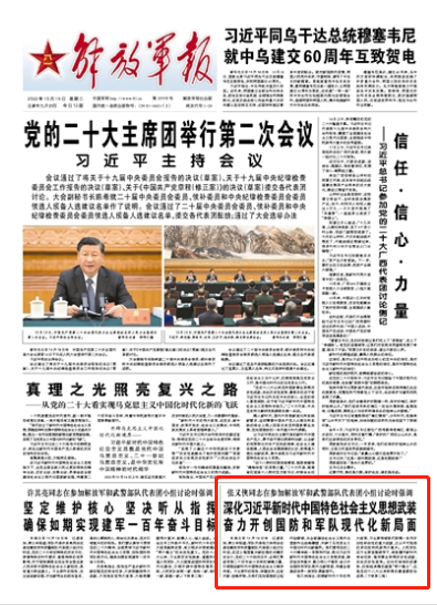 解放軍報(bào)北京10月18日電 記者歐燦、費(fèi)士廷報(bào)道:軍隊(duì)代表張又俠同志在參加解放軍和武警部隊(duì)代表團(tuán)小組討論時(shí)說,在邁上強(qiáng)國復(fù)興新征程的關(guān)鍵歷史當(dāng)口,黨的二十大勝利召開,必將匯聚進(jìn)軍第二個(gè)百年奮斗目標(biāo)的磅礴力量,引領(lǐng)推動(dòng)新時(shí)代中國特色社會主義闊步向前。習(xí)主席作的報(bào)告,舉旗定向、應(yīng)變開新、經(jīng)略布勢,為我們黨治國理政立起行動(dòng)綱領(lǐng),為全面建設(shè)社會主義現(xiàn)代化國家作出戰(zhàn)略擘畫,開辟了馬克思主義中國化時(shí)代化新境界。我們要用黨的二十大精神統(tǒng)一思想和行動(dòng),深化習(xí)近平新時(shí)代中國特色社會主義思想武裝,踔厲奮發(fā)向復(fù)興,勠力同心干強(qiáng)軍,奮力開創(chuàng)國防和軍隊(duì)現(xiàn)代化新局面,向著全面建成世界一流軍隊(duì)勇毅前行。