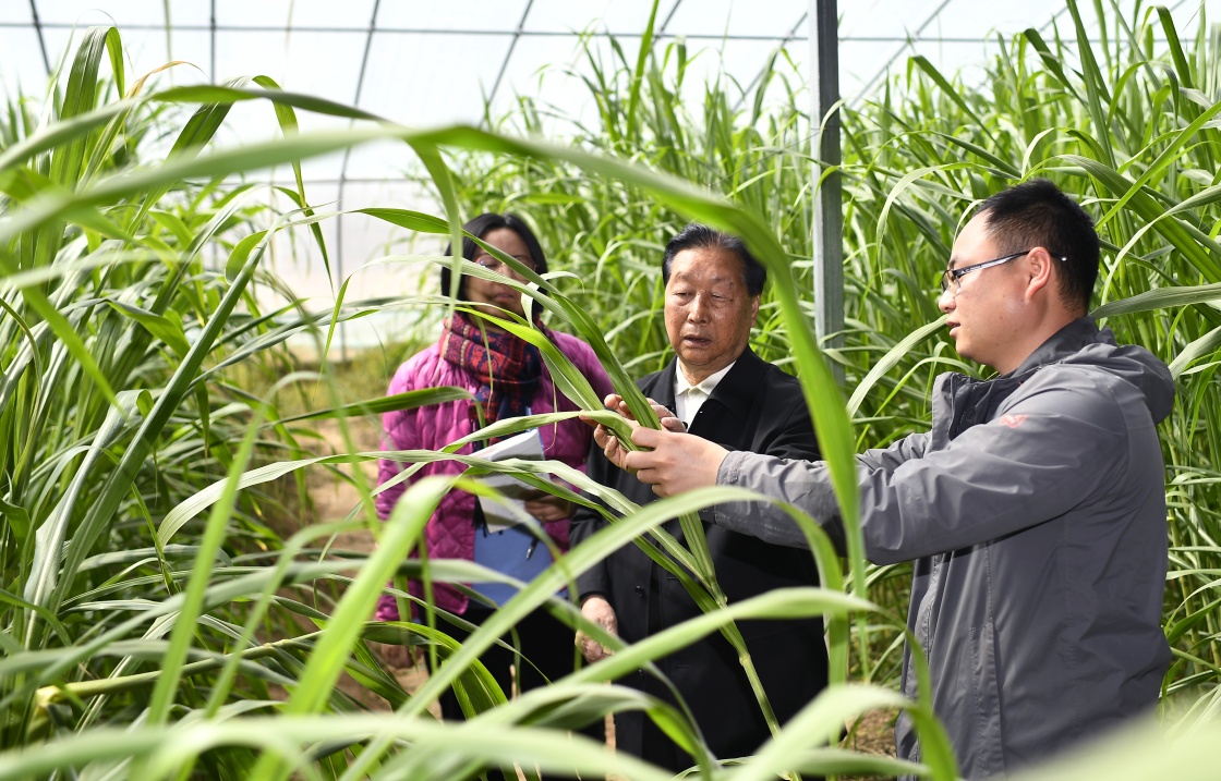 菌草專家林占熺(中)在寧夏銀川市永寧縣閩寧鎮(zhèn)農(nóng)戶劉昌富的大棚里查看菌草生長情況(2021年3月29日攝)。新華社記者 王鵬 攝