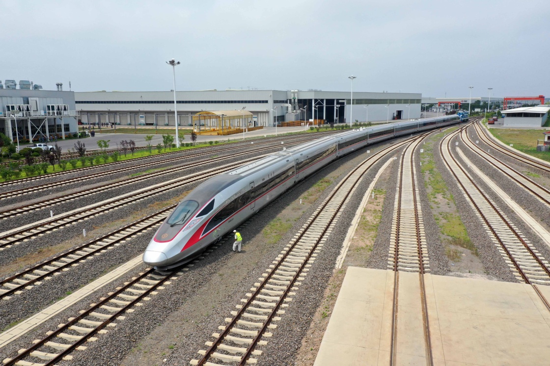 在位于山東青島的中車(chē)四方股份公司,一輛復(fù)興號(hào)列車(chē)正在出廠(2021年7月1日攝)。新華社發(fā)