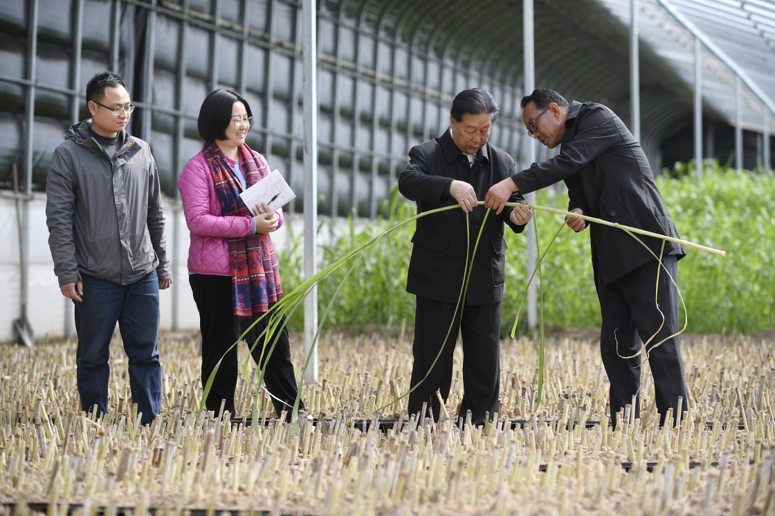在寧夏銀川市永寧縣閩寧鎮(zhèn),福建農(nóng)林大學(xué)教授林占熺(右二)與農(nóng)戶交流菌草種植技術(shù)(2021年3月29日攝)。新華社記者 王鵬 攝