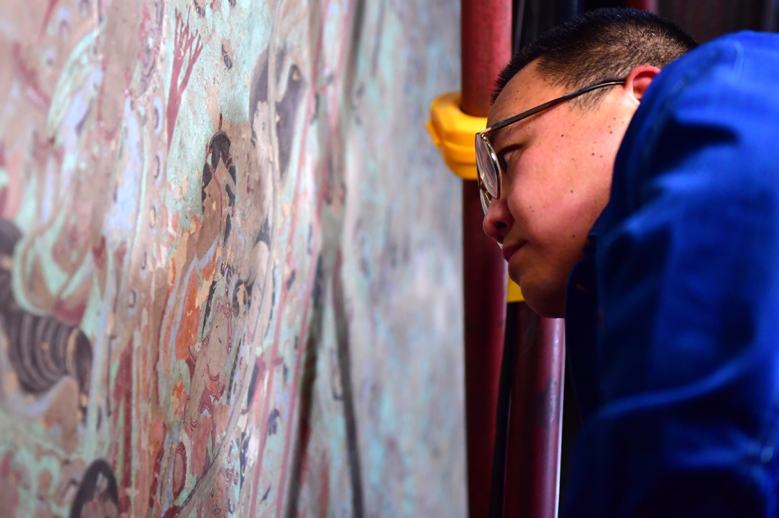 在莫高窟第231窟,敦煌研究院文物保護(hù)技術(shù)服務(wù)中心的壁畫(huà)修復(fù)工作者在修復(fù)出現(xiàn)病害的壁畫(huà)(2022年4月19日攝)。新華社記者 杜哲宇 攝