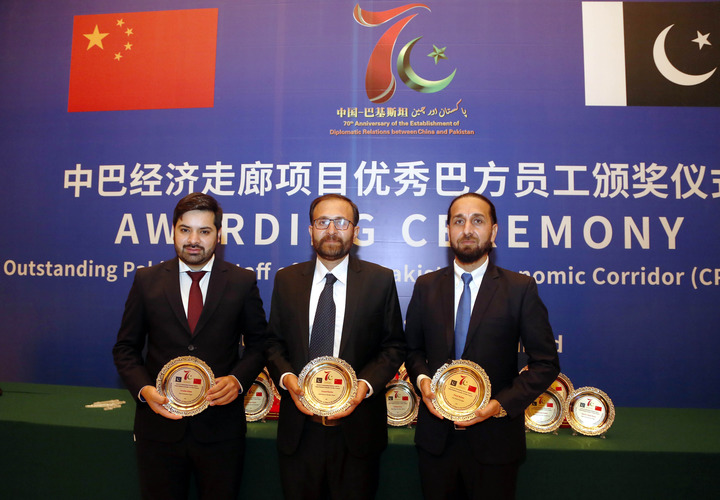 2021年12月29日,優(yōu)秀員工代表在巴基斯坦伊斯蘭堡舉行的中巴經(jīng)濟(jì)走廊項(xiàng)目優(yōu)秀巴基斯坦員工頒獎(jiǎng)儀式上合影。