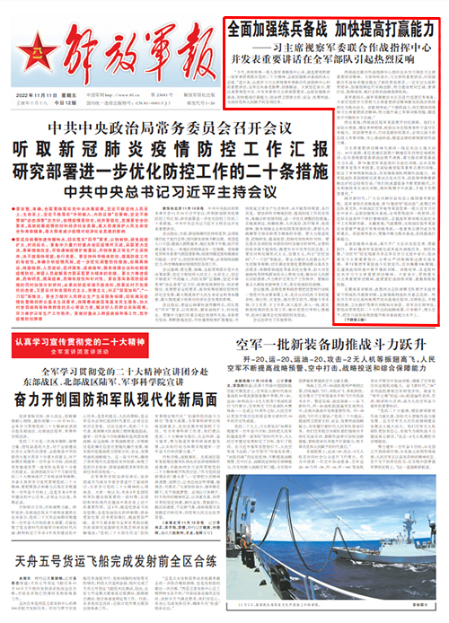 (解放軍報(bào)北京11月10日電 記者康子湛、賴瑜鴻,特約記者楊曉波、曹先訓(xùn)、楊紹通,通訊員孫鵬、王世卓、茆琳、孫玉華、胡亞楠、張亞莉、徐夢(mèng)玥、陶建霖、滕福民、王旭、湯偉、吳晨偉、謝子宜、李洋、鞠佳男、趙梓淇、許韶玉、趙守創(chuàng)等采寫)