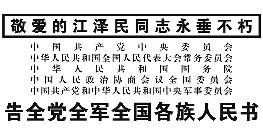 中國共產(chǎn)黨中央委員會、中華人民共和國全國人民代表大會常務(wù)委員會、中華人民共和國國務(wù)院、中國人民政治協(xié)商會議全國委員會、中國共產(chǎn)黨和中華人民共和國中央軍事委員會,極其悲痛地向全黨全軍全國各族人民通告:我們敬愛的江澤民同志患白血病合并多臟器功能衰竭,搶救無效,于2022年11月30日12時13分在上海逝世,享年96歲。