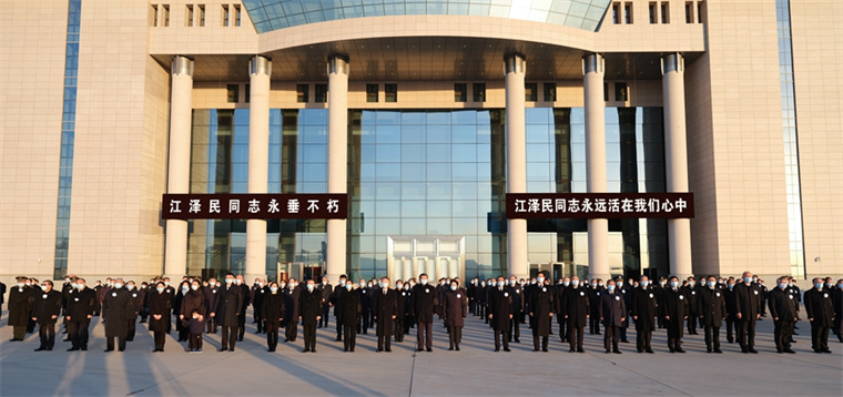 北京西郊機場國旗半垂,氣氛莊嚴肅穆,黑底白字橫幅上寫著:“江澤民同志永垂不朽”“江澤民同志永遠活在我們心中”。習近平和夫人彭麗媛等胸佩白花、臂戴黑紗,神情凝重地在停機坪肅立。