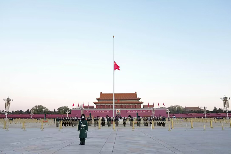 首都北京,天安門廣場。12月1日清晨,凜冽寒風(fēng)中,人們靜靜肅立。升國旗、下半旗儀式開始。