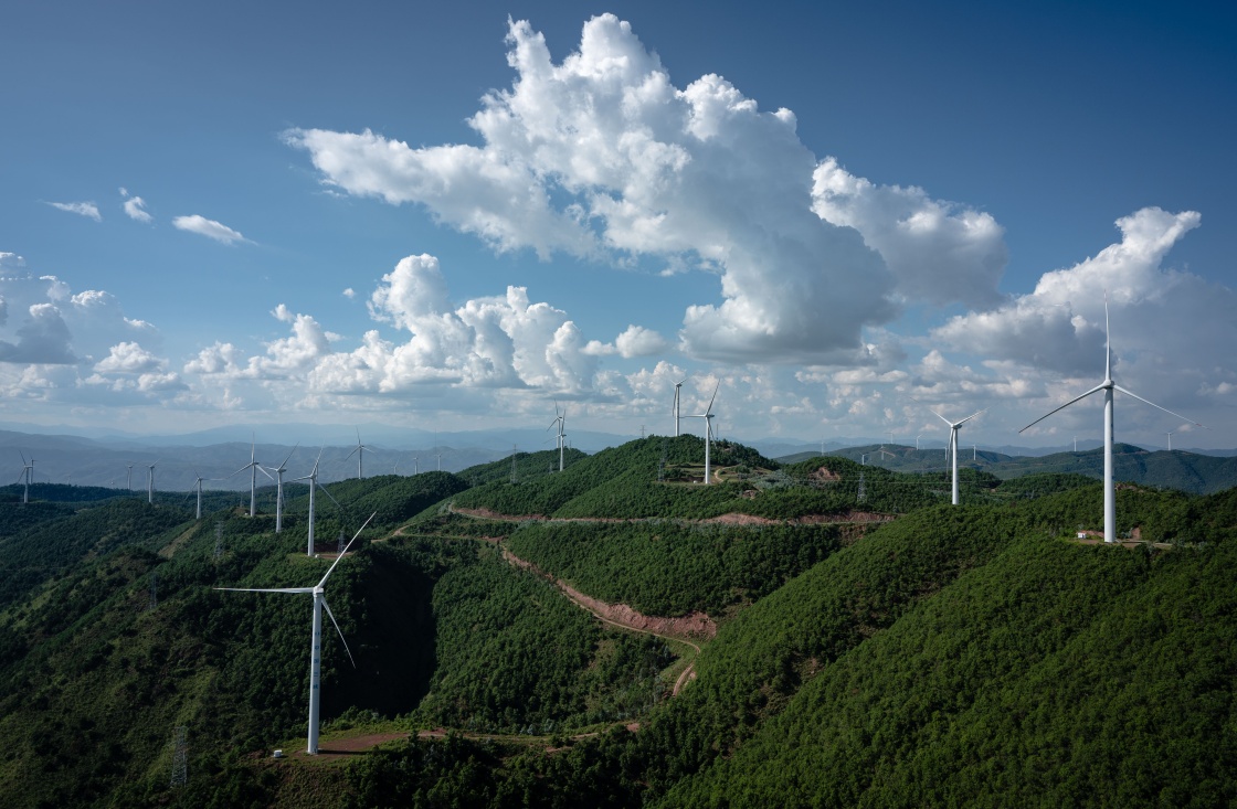 這是2022年8月18日在云南省楚雄彝族自治州姚安縣內(nèi)拍攝的風力發(fā)電機。新華社記者 王冠森 攝
