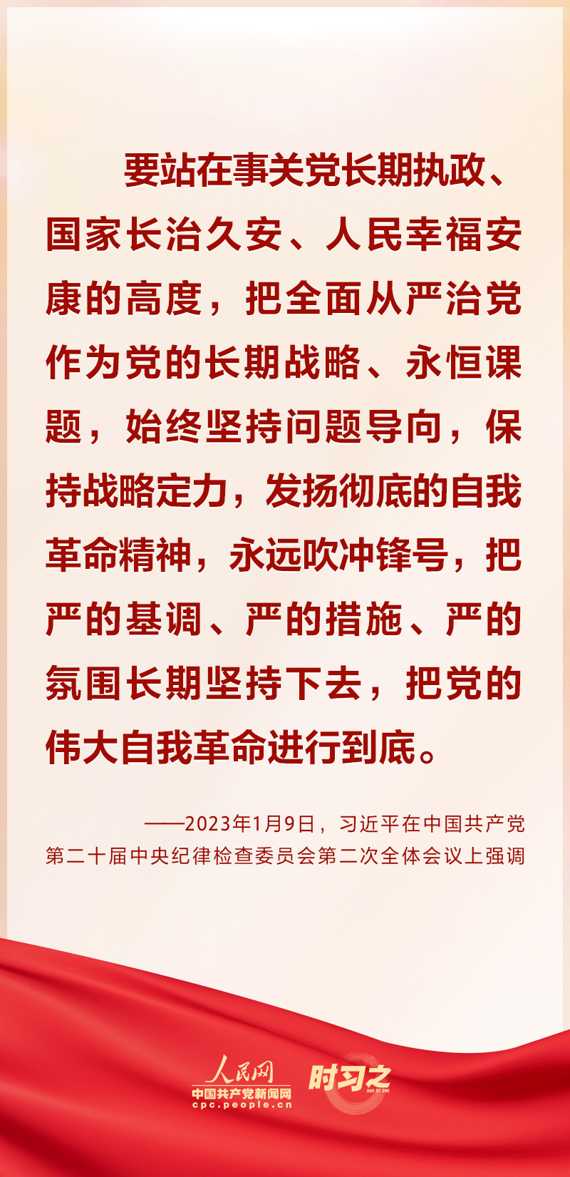 2023年1月9日上午,中共中央總書記、國家主席、中央軍委主席習(xí)近平在中國共產(chǎn)黨第二十屆中央紀(jì)律檢查委員會(huì)第二次全體會(huì)議上發(fā)表重要講話。習(xí)近平在講話中強(qiáng)調(diào)要“發(fā)揚(yáng)徹底的自我革命精神”“把黨的偉大自我革命進(jìn)行到底”。一直以來,習(xí)近平多次在重要場(chǎng)合對(duì)“自我革命”這個(gè)重要課題進(jìn)行深入闡釋,一起學(xué)習(xí)領(lǐng)悟。