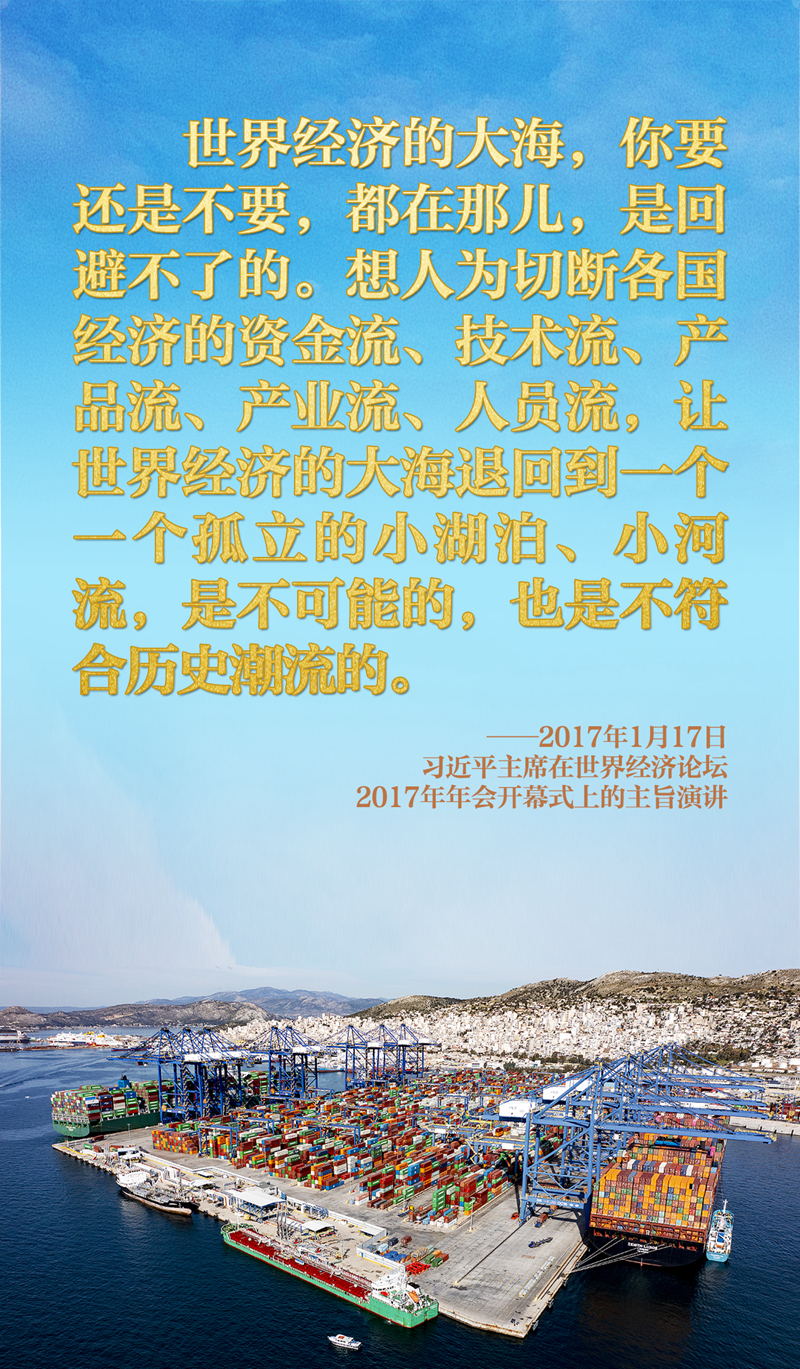 經(jīng)濟全球化何去何從?習近平主席在達沃斯論壇上作出明確回答:“世界經(jīng)濟的大海,你要還是不要,都在那兒,是回避不了的。想人為切斷各國經(jīng)濟的資金流、技術(shù)流、產(chǎn)品流、產(chǎn)業(yè)流、人員流,讓世界經(jīng)濟的大海退回到一個一個孤立的小湖泊、小河流,是不可能的,也是不符合歷史潮流的。”