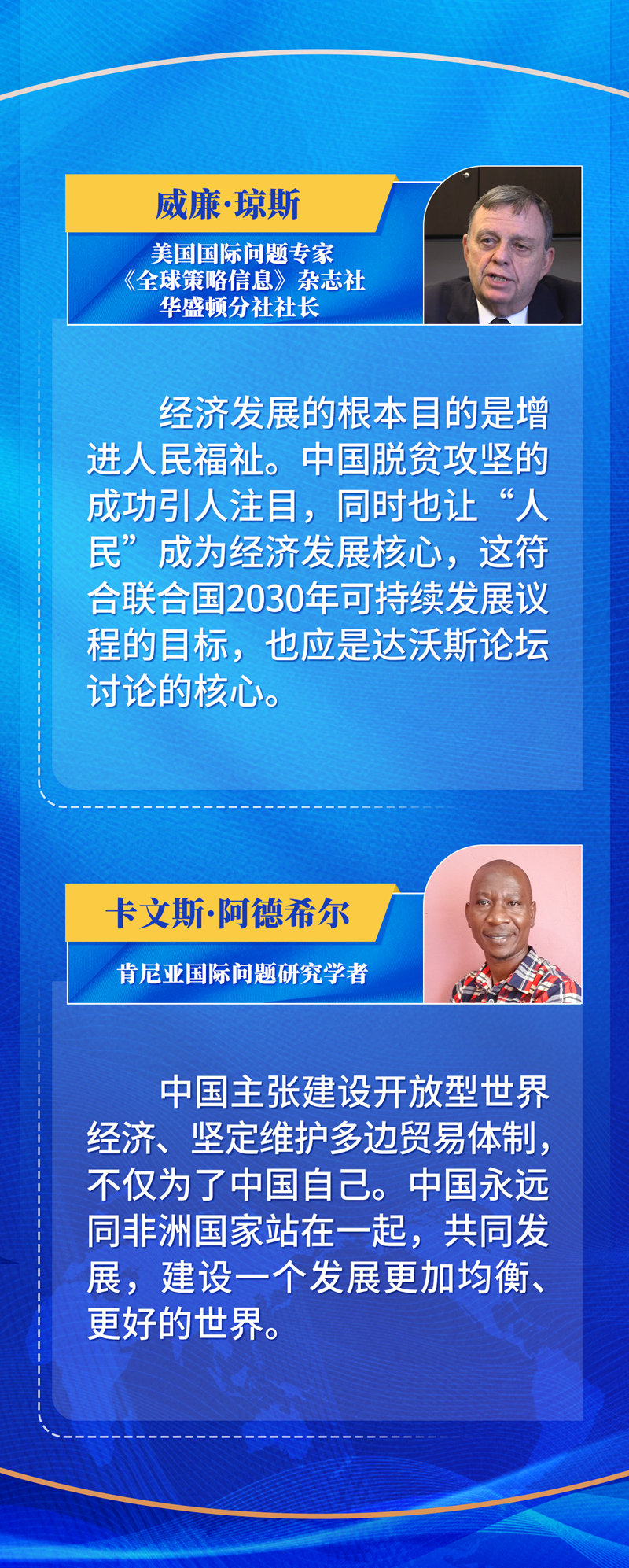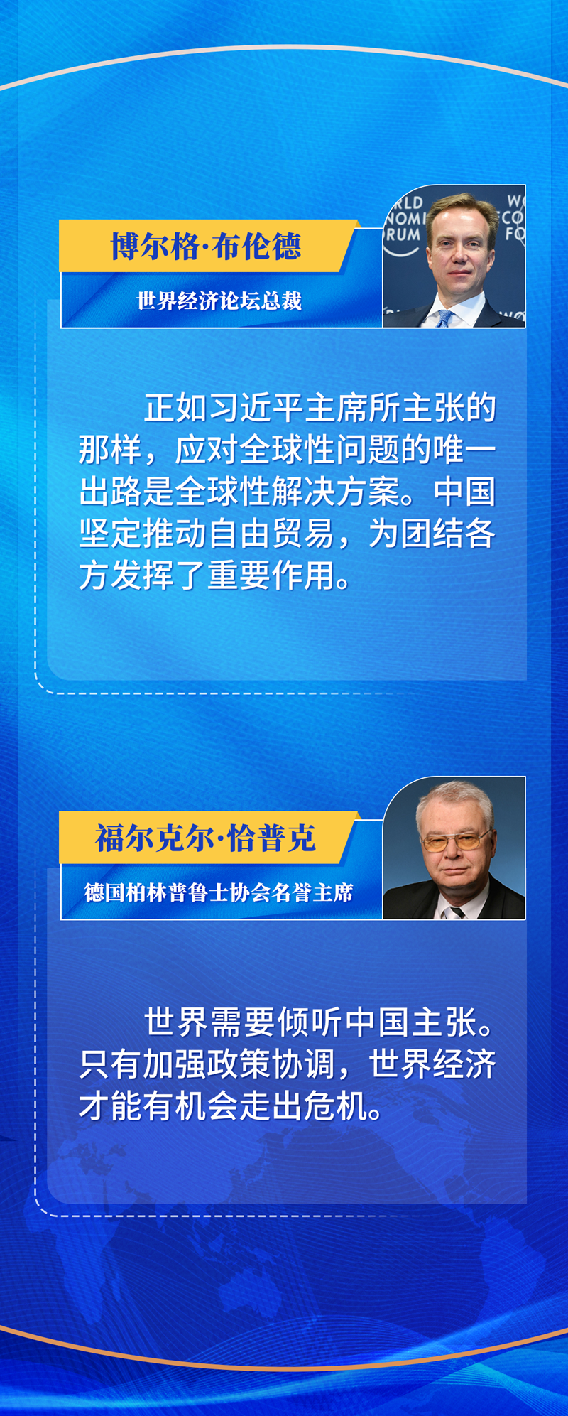 今年的達沃斯論壇年會以“在分裂的世界中加強合作”為主題。對習近平主席的主張,世界經(jīng)濟論壇總裁博爾格·布倫德深表認同。他說,應對全球性問題的出路是全球性解決方案。“中國堅定推動自由貿(mào)易,為團結(jié)各方發(fā)揮了重要作用。”