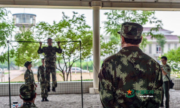 學(xué)校選培辦主任親自督戰(zhàn),這是學(xué)員做單杠引體向上,男生做5個是及格,想要優(yōu)秀成績做夠12個。