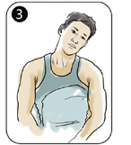 ??? 自預備式,頭部緩慢偏向左側(cè),感覺讓左耳向左肩貼近,使右側(cè)頸肩肌肉感到繃緊為止,同時右臂盡力向下伸,脊柱保持挺直。之后緩慢放松回復到預備式。