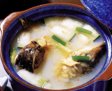 做法:冬瓜去皮,洗凈切三角塊,草魚(yú)剖凈,留尾洗凈待用。用油將草魚(yú)煎至金黃色,取沙鍋一個(gè),其內(nèi)放入清水適量,將魚(yú)、冬瓜一同放入沙鍋內(nèi)。武火燒開(kāi)后,改用文火燉至2小時(shí)左右。湯見(jiàn)白色,加入食鹽、味精調(diào)味即可食用。