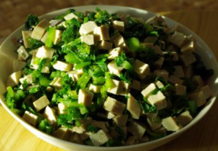 做法:芹菜切成小段,豆腐切成小方丁,均用開水焯一下,撈出后用涼開水冷卻,控凈水待用。將芹菜和豆腐攪拌,加入食鹽、味精、香油拌攪勻即成。