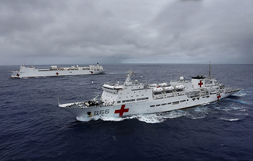 一陣細雨過后,素有“彩虹之州”之稱的夏威夷上空掛出一彎美麗的七色之光,橫跨在戰(zhàn)艦云集的太平洋戰(zhàn)略要地——珍珠港。在這些銀灰色的戰(zhàn)艦中,有兩艘全身潔白、點綴著鮮紅十字的艦船格外引人注目,它們就是中國海軍和平方舟醫(yī)院船和美國海軍“仁慈”號醫(yī)院船。從6月26日開始,這兩艘醫(yī)院船在為期一個多月的演習中,通過參觀體驗、醫(yī)學交流、聯(lián)合救援、駐船見學等形式開展了近20場“對話”,分享各自醫(yī)療服務和災難救援的經(jīng)驗,架起了一彎動人的醫(yī)學交流之虹。