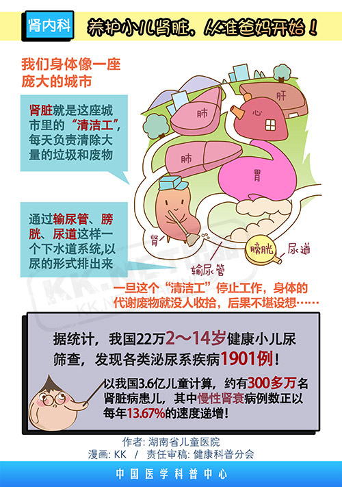 我們身體像一座龐大的城市,腎臟就是這座城市里的“清潔工”,每天負責清除大量的垃圾和廢物,通過輸尿管、膀胱、尿道這樣一個下水道系統(tǒng)以尿的形式排出來,一旦這個“清潔工”停止工作,身體的代謝廢物就沒人收拾,后果不堪設想……據(jù)統(tǒng)計,我國22萬2~14歲健康小兒尿篩查,發(fā)現(xiàn)各類泌尿系疾病1901例!