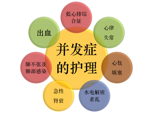 ①低心排綜合癥(LCOS):低心排綜合癥的臨床表現(xiàn):a.心率快,血壓低,收縮壓在90mmHg以下,脈壓差<20mmHg;b.尿少,每小時(shí)<0.5ml/kg,持續(xù)2小時(shí)或以上;c.面色蒼白,呼吸困難;d.身體中心與指趾端溫差大于4~6℃,持續(xù)2小時(shí)或以上?;颊叱霈F(xiàn)上述4項(xiàng)中的2項(xiàng),應(yīng)該注意:a.謹(jǐn)慎擴(kuò)血管、補(bǔ)充血容量,給予血管活性藥物微泵注射,根據(jù)血壓調(diào)節(jié)藥物用量;b.對于嚴(yán)重低心排者,可盡早采用主動(dòng)脈內(nèi)球囊反搏術(shù)(IABP);c.術(shù)后嚴(yán)密監(jiān)測病人的神志、意識、心率、心律、呼吸、尿量、引流量及末梢循環(huán)。