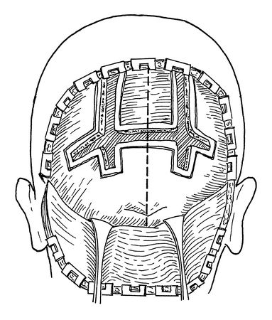 兒童期手術(shù),因頭顱比較大,須分別在頂前、頂后做兩個(gè)冠狀切口,兩切口間距離應(yīng)夠?qū)挘悦忸^皮發(fā)生壞死。顱骨切除方法同上。