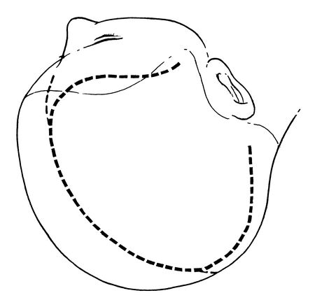 (1)做半顱大切口,始于一側(cè)額顳部發(fā)際,沿額骨粗隆中部轉(zhuǎn)向中線,經(jīng)矢狀縫至人字縫尖,再由此呈弓形向下,平行于人字縫,止于距耳郭2cm處,形成一個大的頭皮瓣,并越過顳肌上緣,翻向顳側(cè)(圖14)。
