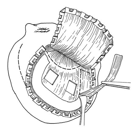 (2)沿切口環(huán)形切除顱骨骨膜,寬3cm,再于額頂和頂枕部各切除一塊骨膜,約2cm×2cm。也可將額頂枕部骨膜廣泛切除(圖15)。