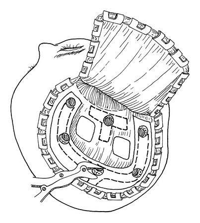 為達到顱骨分離減壓、顱腔擴大的目的,對全顱縫早閉者,可行顱骨廣泛切開術(shù)。手術(shù)在左右兩側(cè)分兩期進行,間隔時間為3~4周,一般先做右側(cè)。
