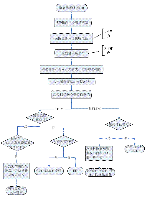 ACS的病理基礎(chǔ)是冠狀動脈狹窄,急診時需要早期快速識別、鑒別診斷,并在最短時間內(nèi)緊急開通病變血管,及時救治AMI患者。如何在最短的時間內(nèi)接診、檢查、急診手術(shù),建立快速有效的診治流程是國內(nèi)外公認(rèn)的醫(yī)學(xué)新課題。美國心臟病學(xué)會(ACC)/美國心臟學(xué)會(AHA)指南推薦,患者從進(jìn)入醫(yī)院大門到心臟冠狀動脈球囊擴(kuò)張(D2B)的搶救時間應(yīng)控制在90分鐘以內(nèi);歐洲心臟病學(xué)會(ESC)指南建議,ST段抬高型心肌梗死(STEMI)患者應(yīng)在首次就診后2小時內(nèi)完成經(jīng)皮冠狀動脈介入治療(PCI);我國中華醫(yī)學(xué)會心血管病學(xué)分會指南指出,如診斷為STEMI,要求10分鐘內(nèi)完成首份心電圖,30分鐘內(nèi)開始溶栓治療,90分鐘內(nèi)完成球囊擴(kuò)張。然而,統(tǒng)計(jì)數(shù)據(jù)顯示,我國患者從發(fā)病到首次醫(yī)療接觸需3-4小時,僅少部分STEMI患者可在指南推薦時間內(nèi)獲得PCI治療。因此,改善我國急性胸痛和ACS治療規(guī)范,建立院內(nèi)胸痛中心/綠色通道以及落實(shí)指南工作流程至關(guān)重要。