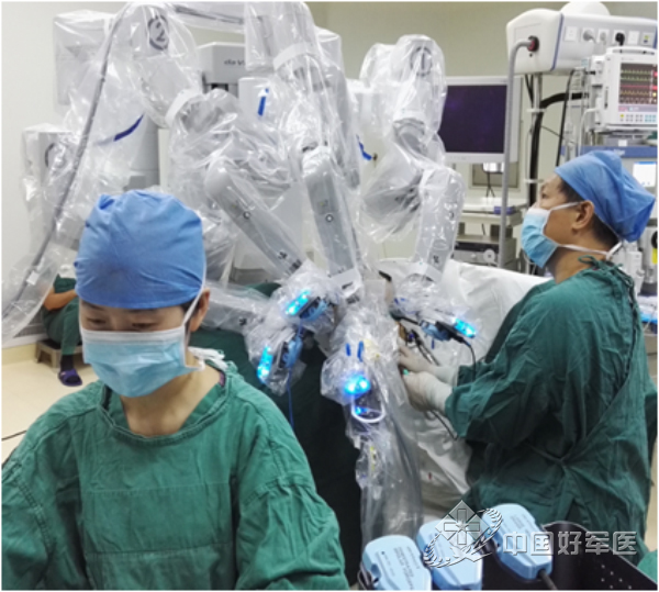 圖為高江平主任術中操縱床旁機械臂系統(tǒng)完成操作
