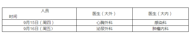1.9月15日-9月16日(周四、周五):上午所有診室正常開放(含專家門診及普通門診),大內、大外全天開診。