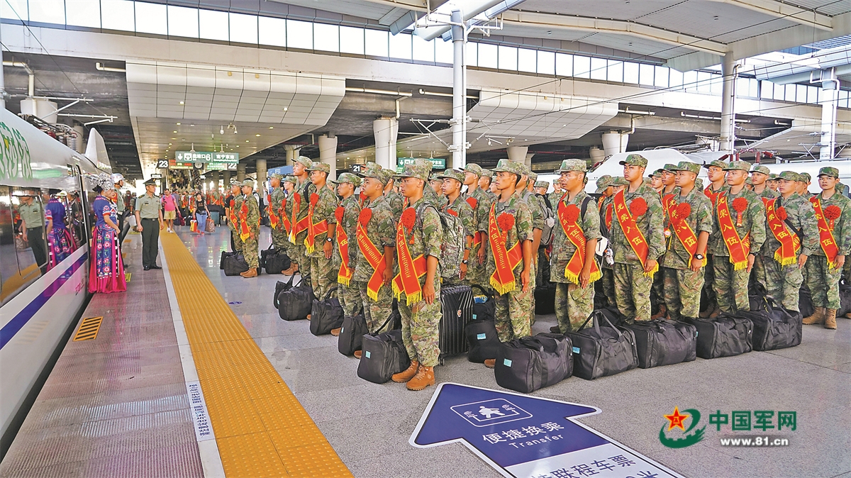 與此同時,千里之外的廣州南站人頭攢動。在鐵路工作人員陳慧專的引導下,400多名新兵有序登上開往北京的G82次“強軍號”國防主題列車。