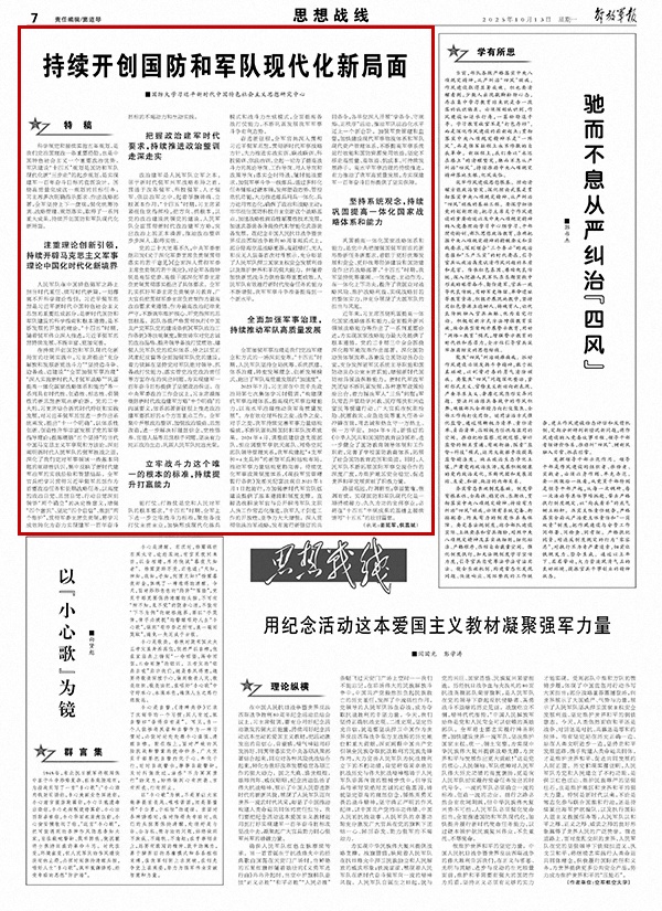 人民軍隊(duì)在中國(guó)特色強(qiáng)軍之路上擔(dān)當(dāng)時(shí)代重任、續(xù)寫時(shí)代新篇,一刻都離不開科學(xué)理論指引。習(xí)近平強(qiáng)軍思想是習(xí)近平新時(shí)代中國(guó)特色社會(huì)主義思想的重要組成部分,是新時(shí)代國(guó)防和軍隊(duì)建設(shè)的科學(xué)指南和根本遵循,是不斷發(fā)展的開放的理論。“十四五”時(shí)期,隨著強(qiáng)軍偉業(yè)深入推進(jìn),習(xí)近平強(qiáng)軍思想持續(xù)發(fā)展、不斷豐富、更加完善。