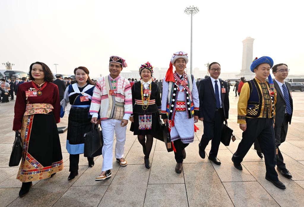 2023年3月5日,第十四屆全國人民代表大會第一次會議在北京人民大會堂開幕。這是全國人大代表走向會場。新華社記者 陳益宸 攝