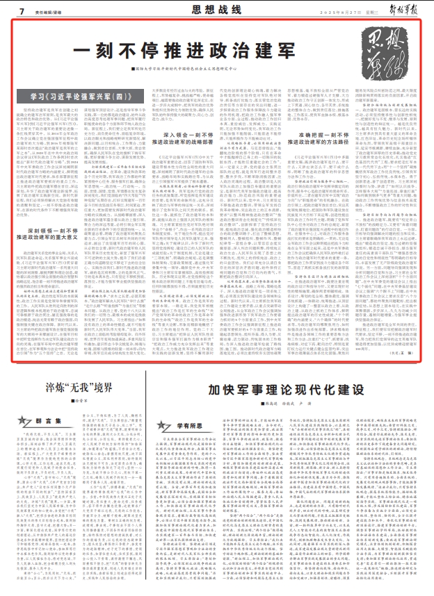 堅持政治建軍是我軍在創(chuàng)建之初就確立的建軍治軍原則,是我軍最大的政治特色和政治優(yōu)勢。從《習(xí)近平論強軍興軍》到《習(xí)近平論強軍興軍(四)》,習(xí)主席關(guān)于政治建軍的重要論述像一條紅線貫穿其中。從2014年全軍政治工作會議確立黨在強國強軍征程中政治建軍的大方略,到2016年視察陸軍某部時首次提出“政治建軍是我軍的立軍之本”,從2020年在中共中央政治局會議審議《軍隊政治工作條例》時首次提出“新時代政治建軍方略”,到2024年中央軍委政治工作會議深刻闡明新時代政治建軍方略的內(nèi)涵要義,鮮明提出政治建軍時代要求,體系部署新征程上推進政治建軍要抓好的重點工作,習(xí)主席始終把政治建軍擺在首位、深遠謀劃,升華了政治建軍理論新境界、拓展了政治建軍實踐新空間。新時代新征程,我們必須保持解決大黨獨有難題的清醒和堅定,一刻不停推進政治建軍,在新的時代條件下不斷增強我軍政治優(yōu)勢。