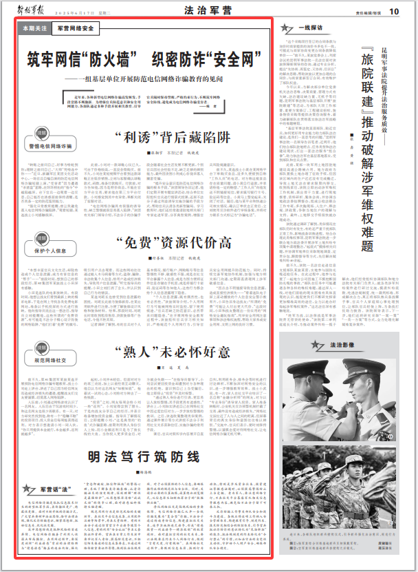 近年來,各種新型電信網(wǎng)絡(luò)詐騙高發(fā)頻發(fā),手段套路不斷翻新。為增強官兵防范意識和安全用網(wǎng)能力,各部隊通過多種手段開展相關(guān)教育,引導(dǎo)官兵隨時保持警醒,嚴(yán)格約束行為,不斷筑牢網(wǎng)絡(luò)安全防線,避免成為電信網(wǎng)絡(luò)詐騙受害者。