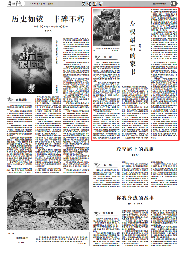 這封家書寫后的第三天,八路軍總部按計(jì)劃轉(zhuǎn)移到山西遼縣十字嶺,轉(zhuǎn)移中被日軍飛機(jī)發(fā)現(xiàn)。左權(quán)在指揮八路軍總部機(jī)關(guān)突圍的血戰(zhàn)中,為掩護(hù)戰(zhàn)友,不幸被彈片擊中,壯烈犧牲,年僅37歲。一顆將星隕落了,山河動(dòng)容。