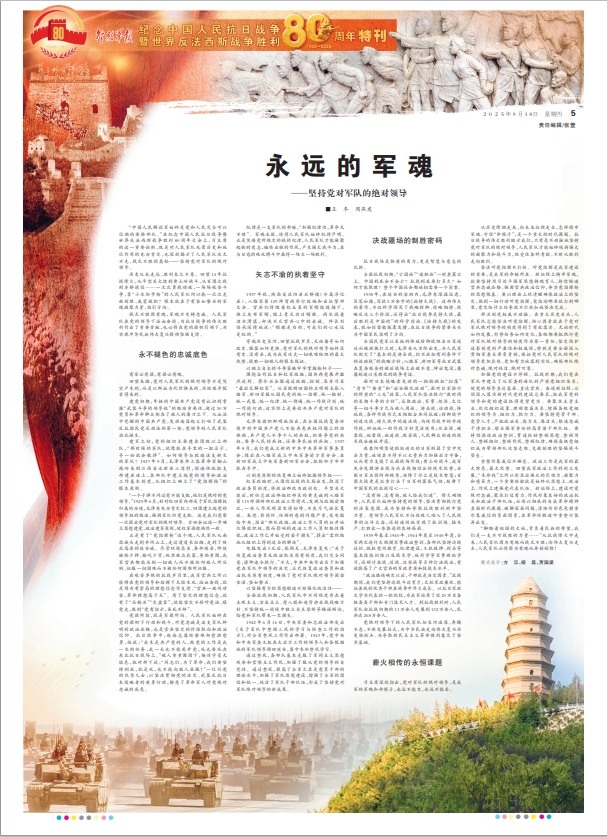 戰(zhàn)無不勝因有魂,軍魂不變鑄忠誠。人民軍隊在黨的領導下浴血奮戰(zhàn),為抗日戰(zhàn)爭的偉大勝利作出了重要貢獻,也必將在黨的旗幟引領下,為實現中華民族偉大復興提供堅強支撐。