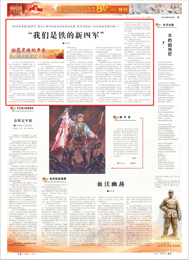 至此,我想起德國記者漢斯·希伯在書稿中寫下的感慨:“我在這里聽到一支非常流行的歌曲,其中唱道‘東進(jìn)!東進(jìn)!我們是鐵的新四軍!’在敵后的長江下游流域,沒有再比這句響亮的歌詞更受歡迎的了——‘我們是鐵的新四軍’?!?/p>
