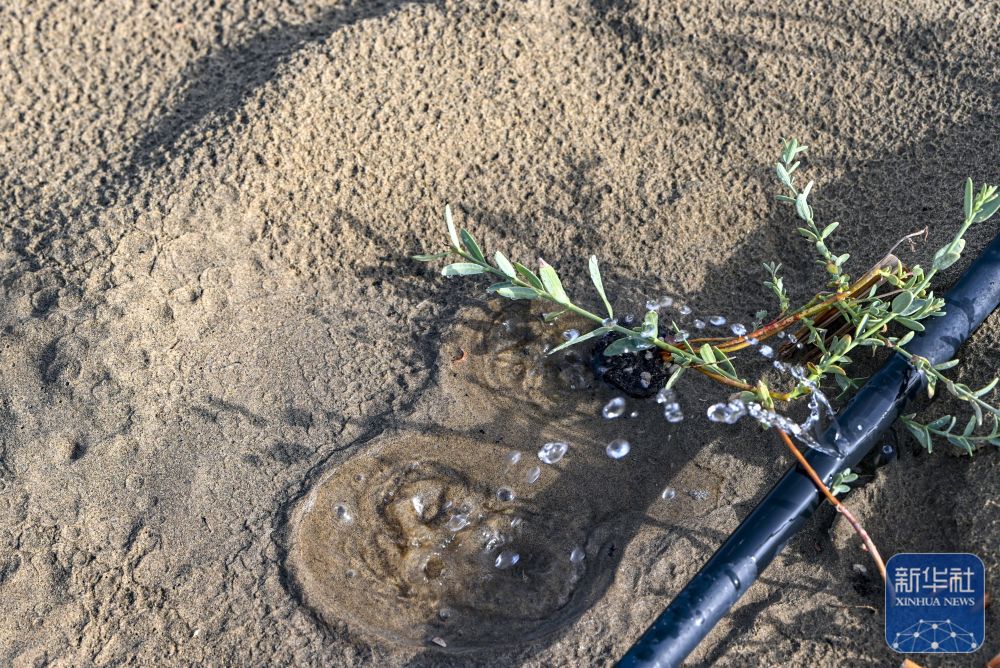 ↑ 9月20日,在新疆尉犁縣境內(nèi)的塔里木河南岸防沙治沙區(qū),工作人員查看滴灌管情況。新華社記者 江文耀 攝