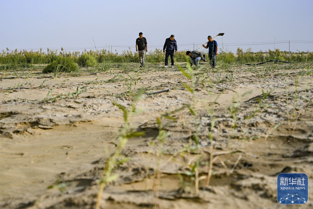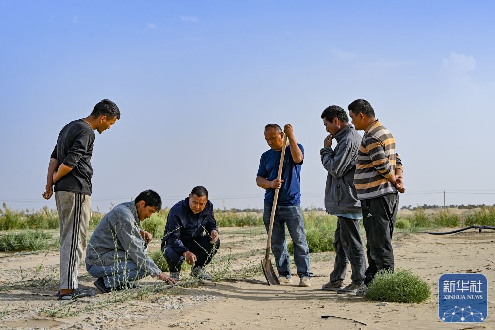 ↑ 9月20日,新疆尉犁縣國(guó)有林管理局護(hù)林員艾力·尼亞孜(左二)和工作人員一起查看羅布麻長(zhǎng)勢(shì)。新華社記者 陳朔 攝