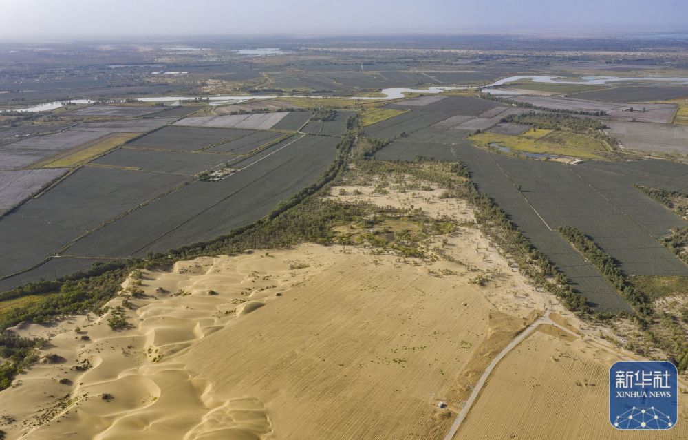 ↑ 在新疆尉犁縣境內(nèi)的塔里木河南岸防沙治沙區(qū)拍攝的羅布麻種植區(qū)(右下)、治理之前自然形成的沙丘(左下)、塔里木河及周圍綠洲(上)(無(wú)人機(jī)照片,9月20日攝)。新華社記者 陳朔 攝