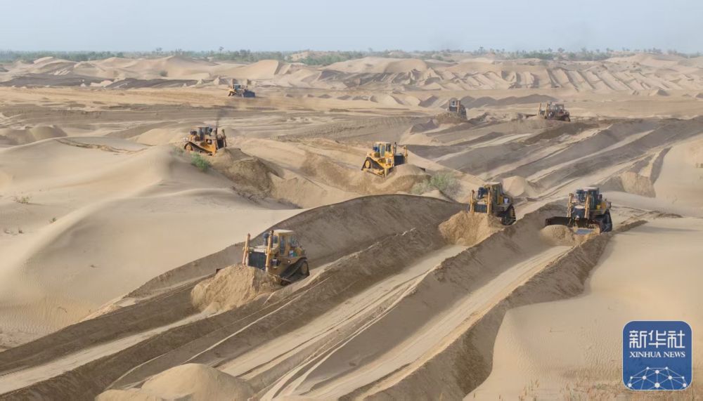 ↑ 5月22日,在新疆尉犁縣境內(nèi)的塔里木河南岸防沙治沙區(qū),大型機(jī)械在平整沙丘(無(wú)人機(jī)照片)。新華社發(fā)(汪志鵬 攝)