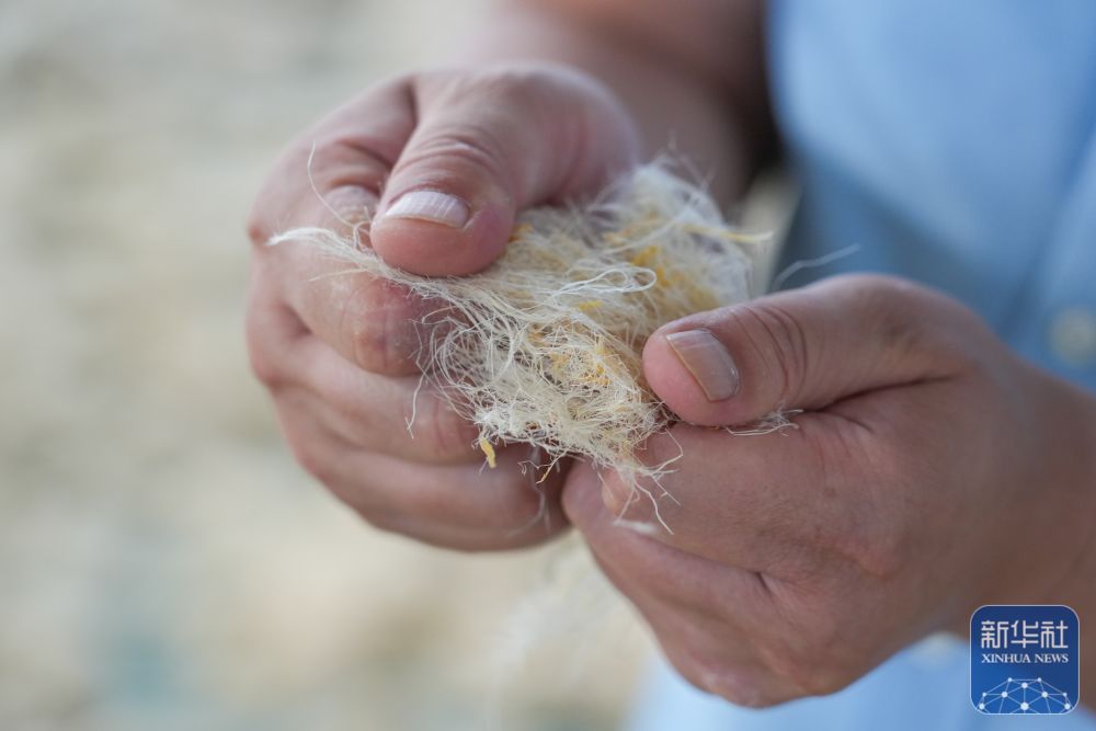 ↑ 9月20日,在新疆尉犁一家服裝公司的羅布麻纖維脫膠車間,工人查看脫膠漂白后的產(chǎn)品品質(zhì)。新華社發(fā)(汪志鵬 攝)