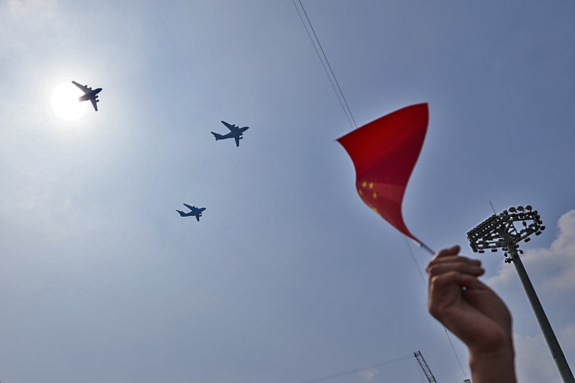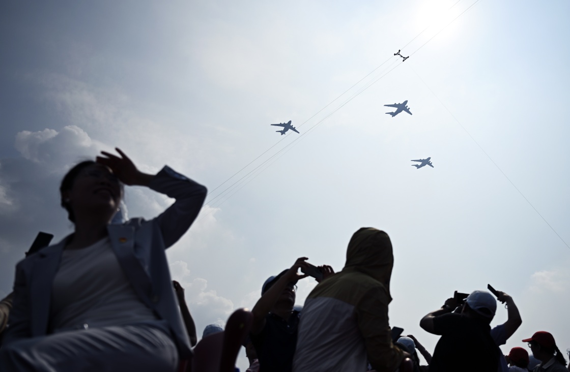 9月3日,紀念中國人民抗日戰(zhàn)爭暨世界反法西斯戰(zhàn)爭勝利80周年大會在北京隆重舉行。這是市民在拍攝運輸機梯隊。