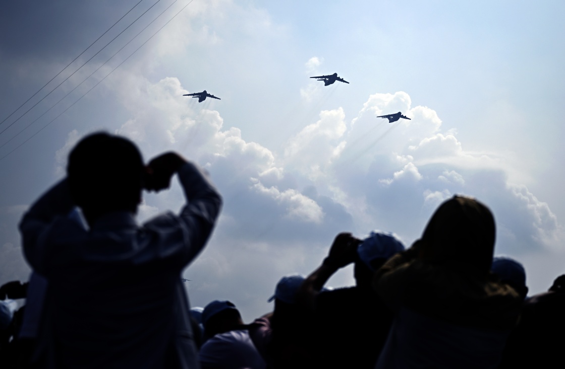 9月3日,紀念中國人民抗日戰(zhàn)爭暨世界反法西斯戰(zhàn)爭勝利80周年大會在北京隆重舉行。這是市民在盧溝橋觀看運輸機梯隊。