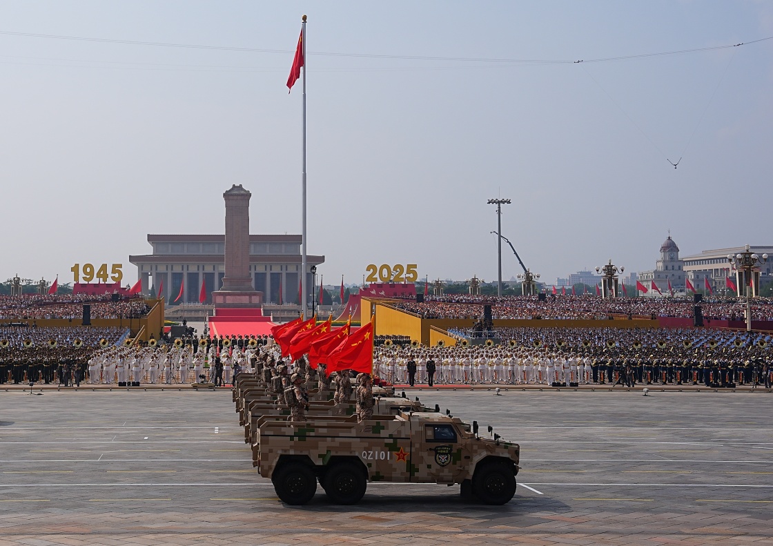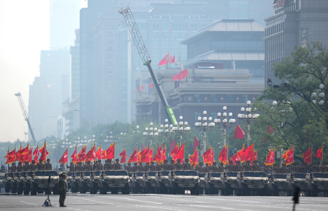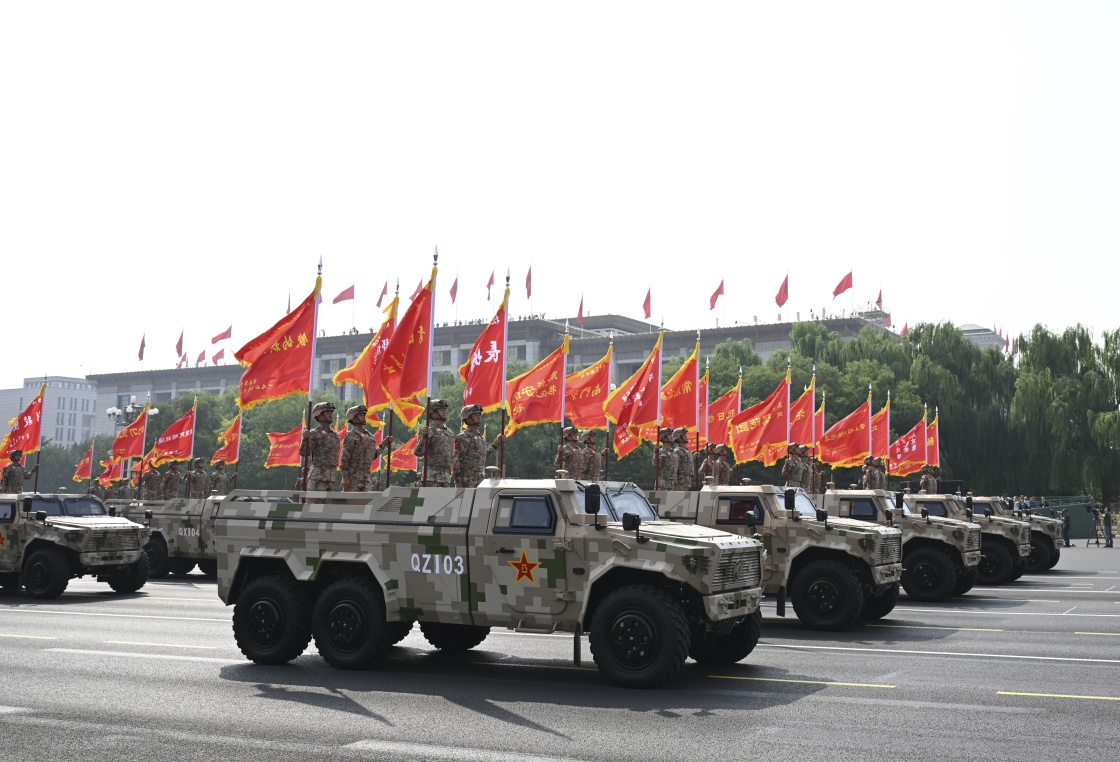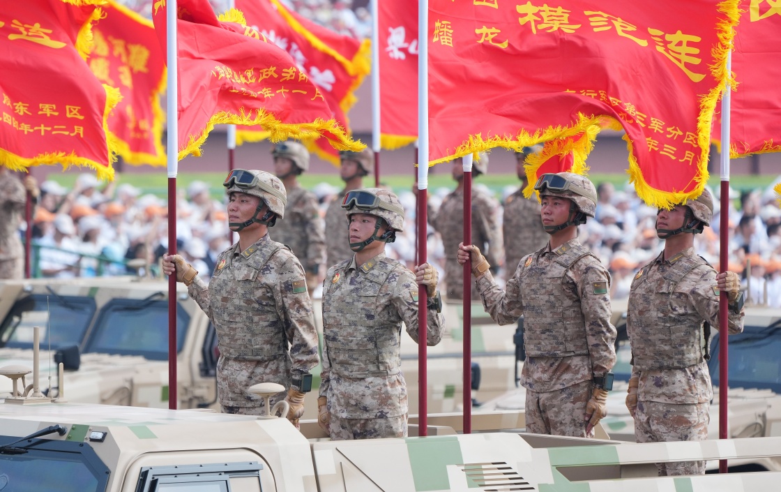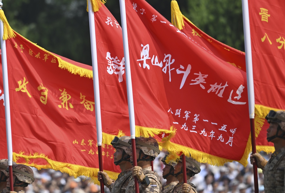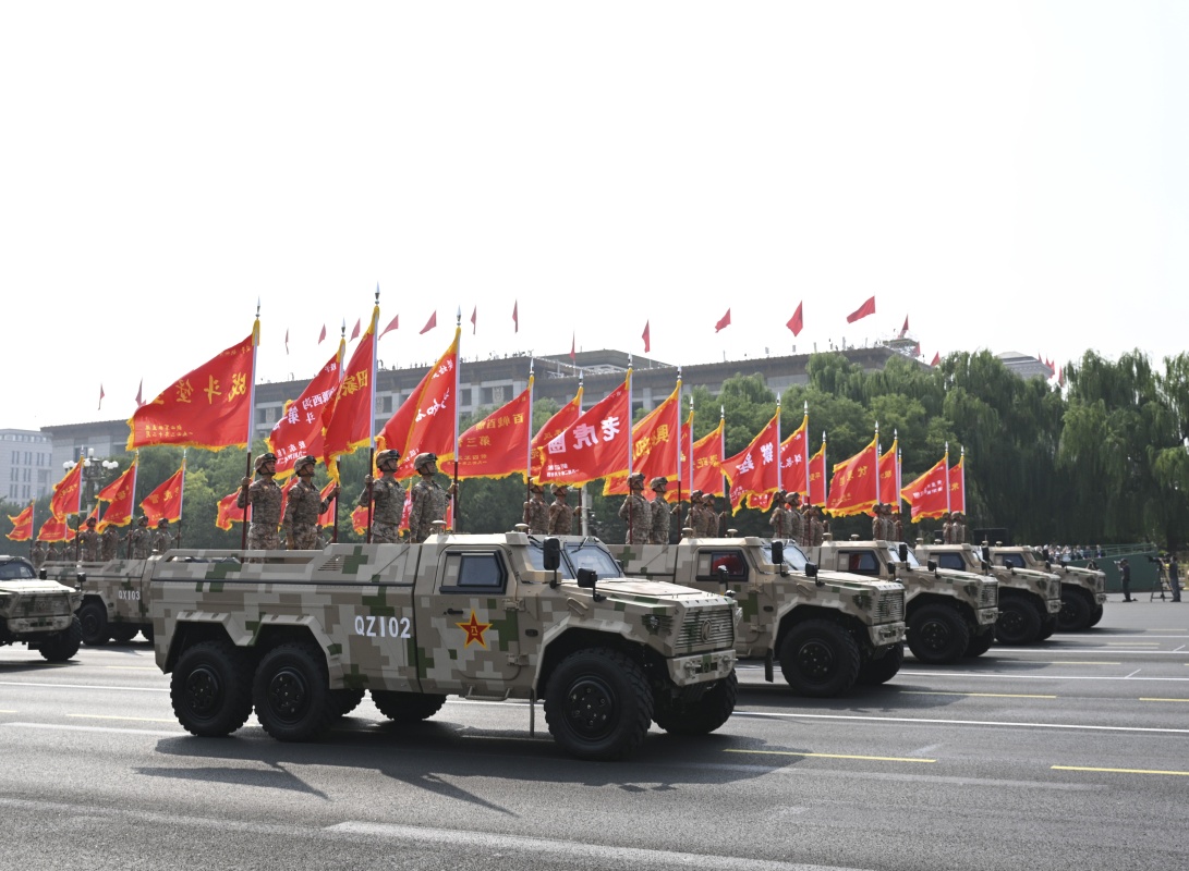 9月3日,紀(jì)念中國(guó)人民抗日戰(zhàn)爭(zhēng)暨世界反法西斯戰(zhàn)爭(zhēng)勝利80周年大會(huì)在北京隆重舉行。這是戰(zhàn)旗方隊(duì)接受檢閱。