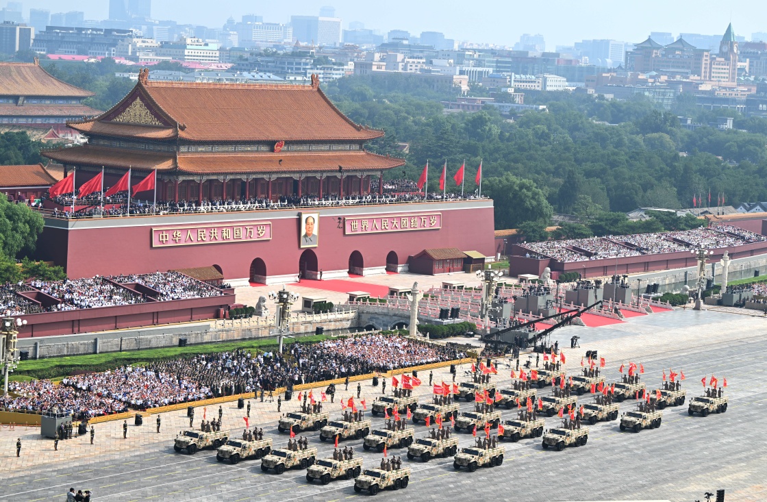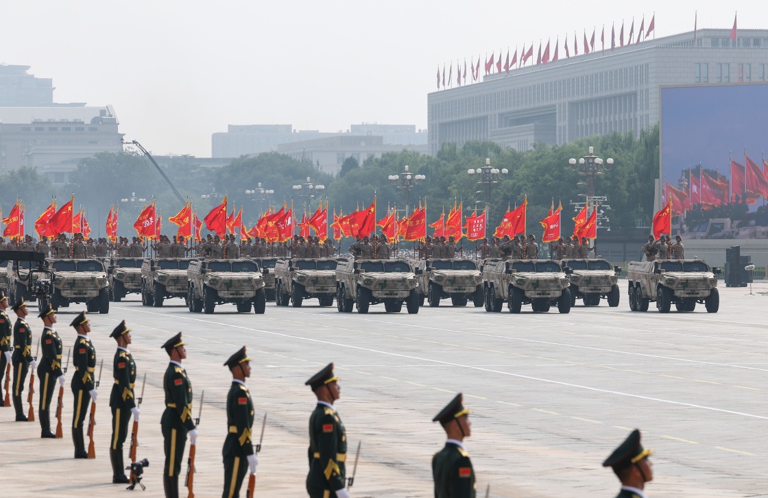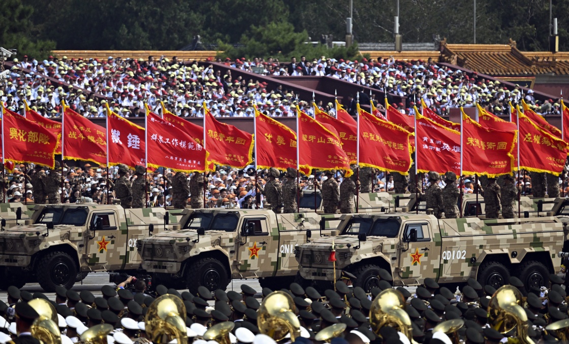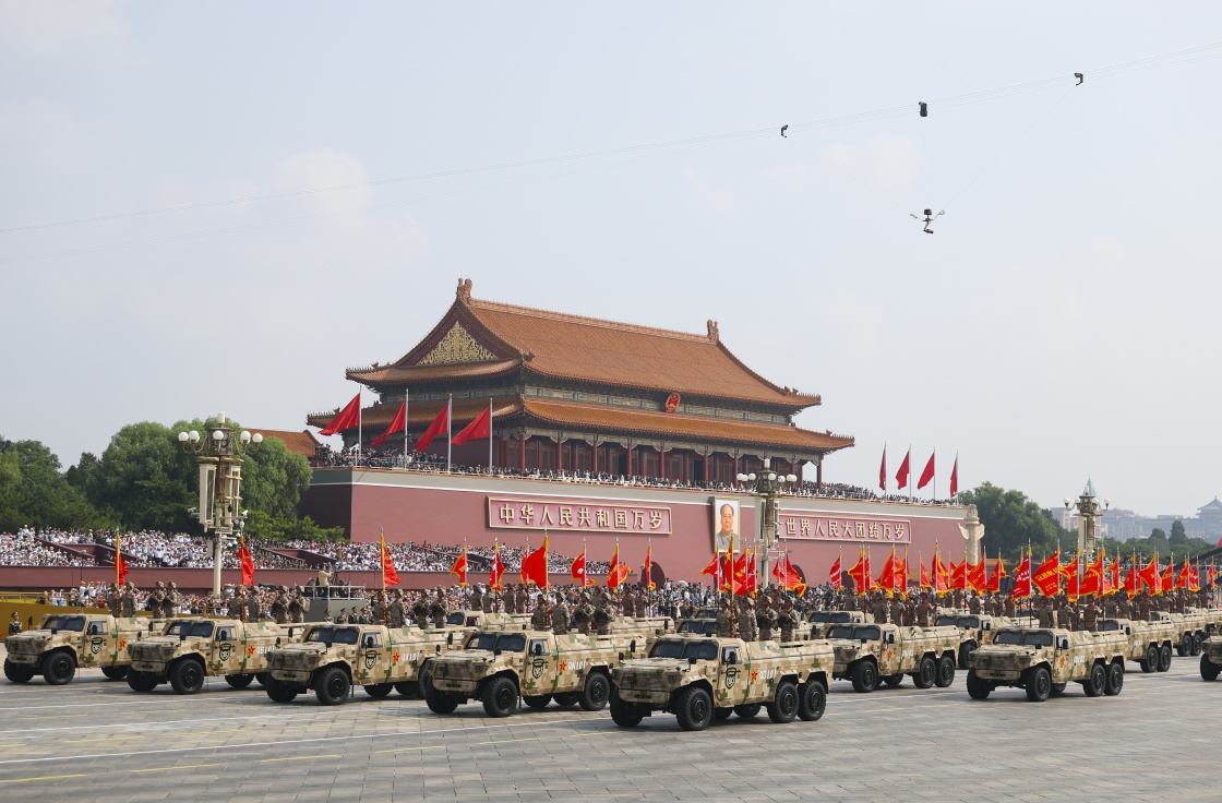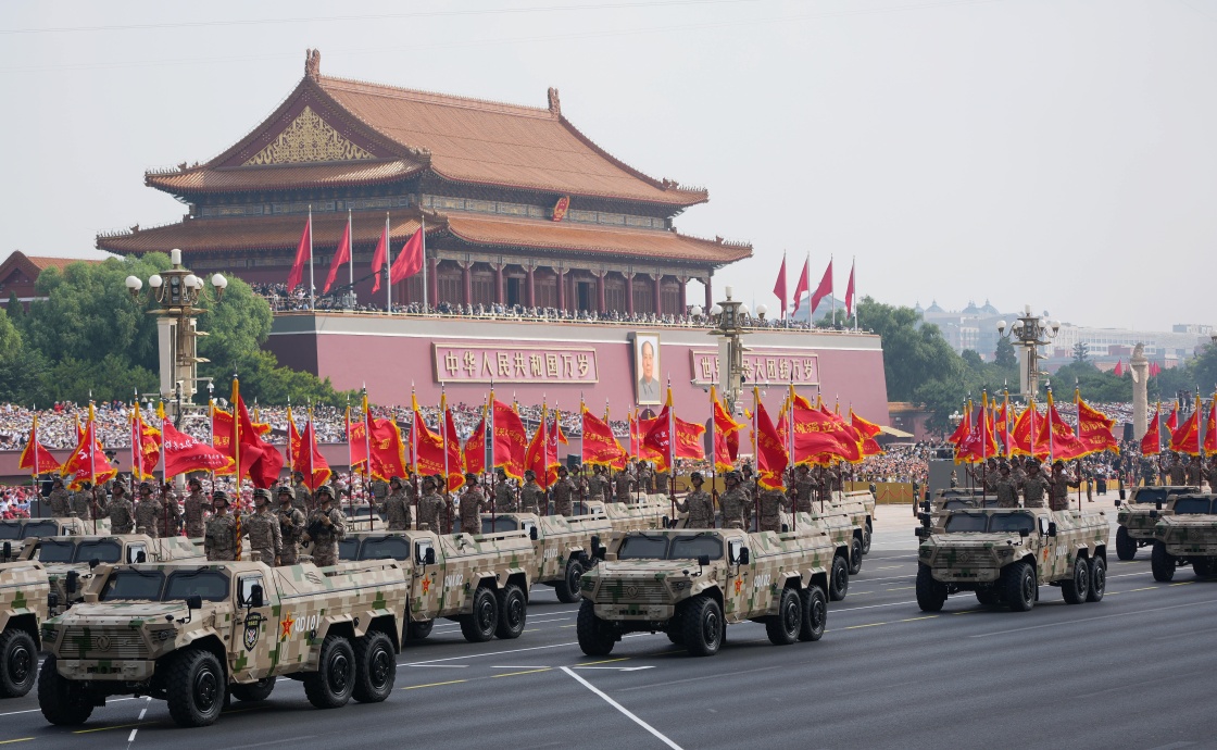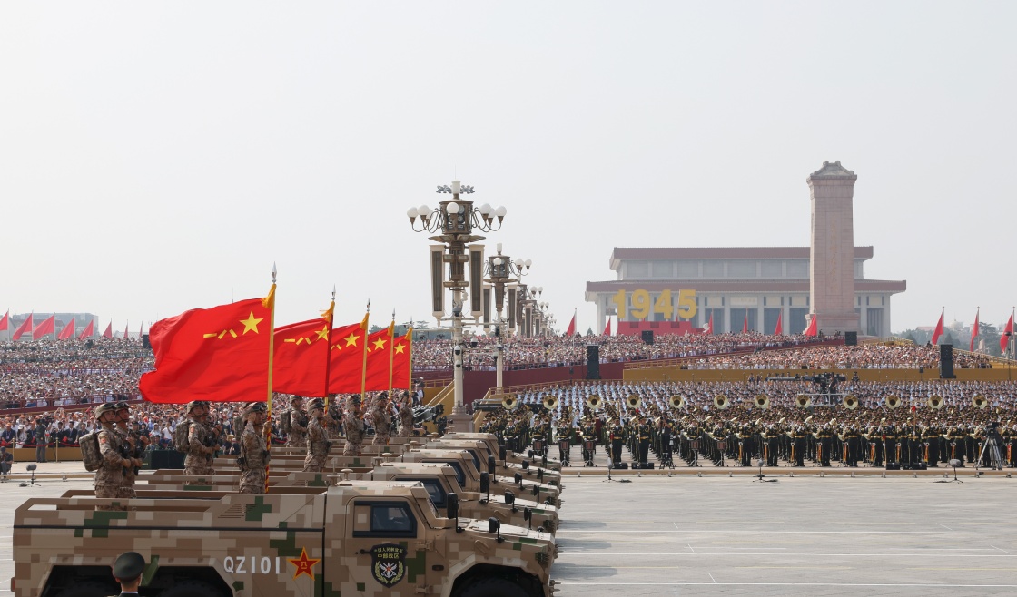 9月3日,紀(jì)念中國(guó)人民抗日戰(zhàn)爭(zhēng)暨世界反法西斯戰(zhàn)爭(zhēng)勝利80周年大會(huì)在北京隆重舉行。這是戰(zhàn)旗方隊(duì)接受檢閱。
