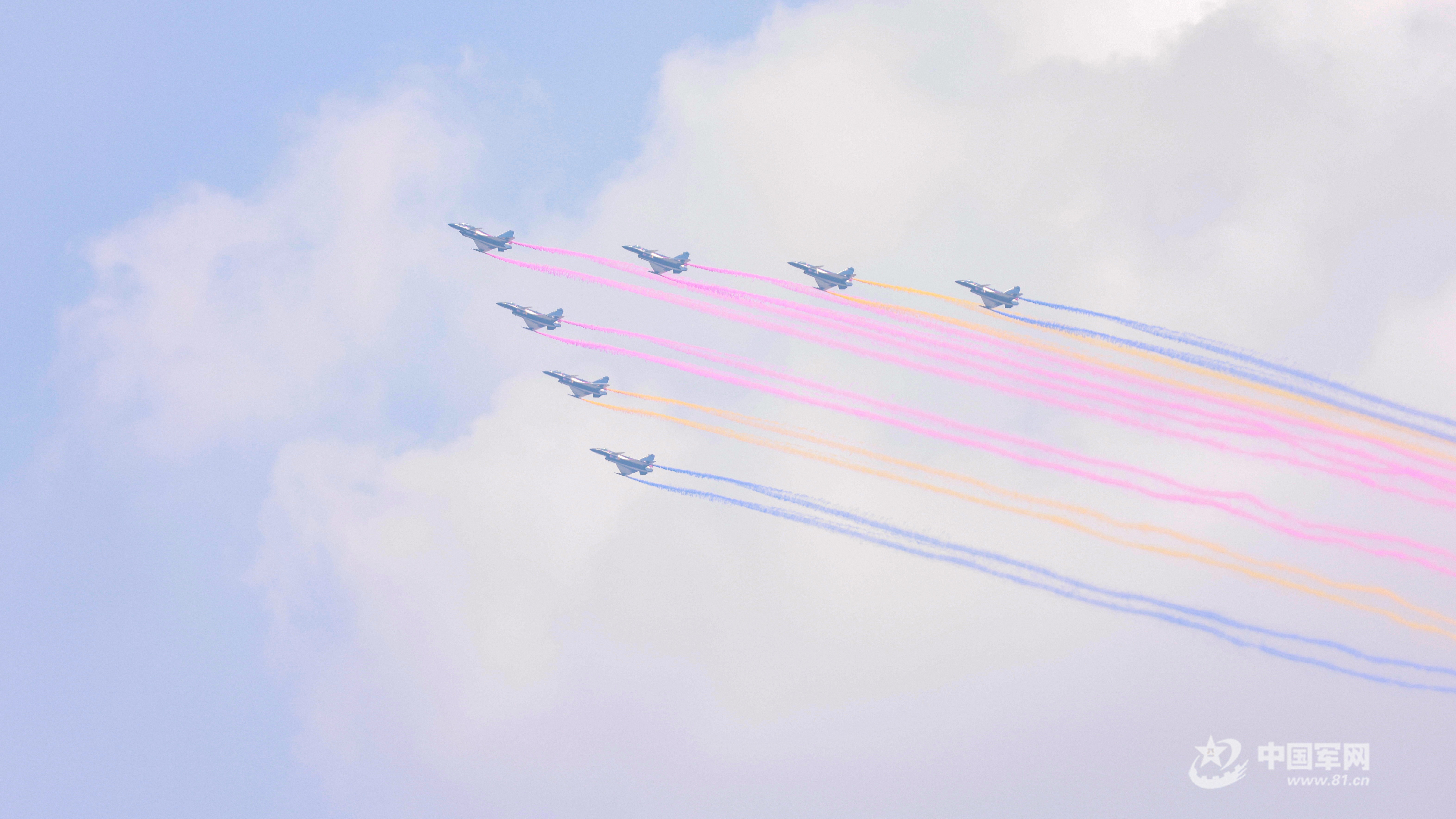 空軍八一飛行表演隊(duì)駕駛殲-10表演機(jī),以超密集編隊(duì)出場(chǎng)。