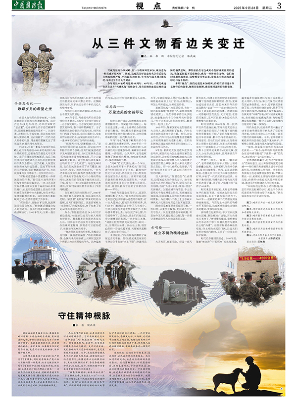 “缺氧不缺精神,艱苦不怕吃苦”“寧可犧牲生命,不丟國土一寸”……這一句句誓言,是一代代邊防官兵的精神寫照。他們“頭頂邊關(guān)月,情系天下安”,不斷續(xù)寫著扎根邊疆的動人故事和守衛(wèi)邊防的不朽詩篇。一代代官兵默默奮斗,手搖發(fā)電機、舊馬鞍、老哨樓等邊防線上的文物,把他們的英雄壯舉和精神根脈永遠保存下來,化為催人奮進的精神路標,激勵著后來者一路堅定向前。