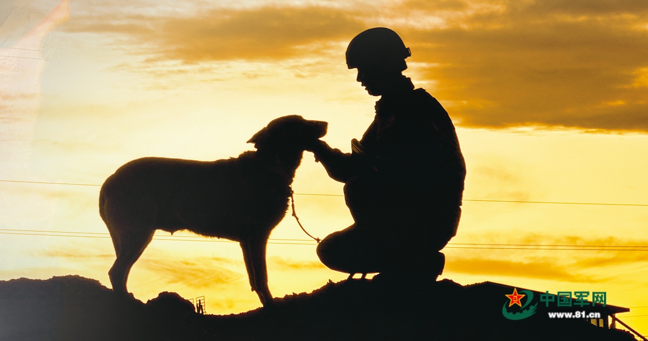 哨兵與軍犬在夕陽下的剪影。