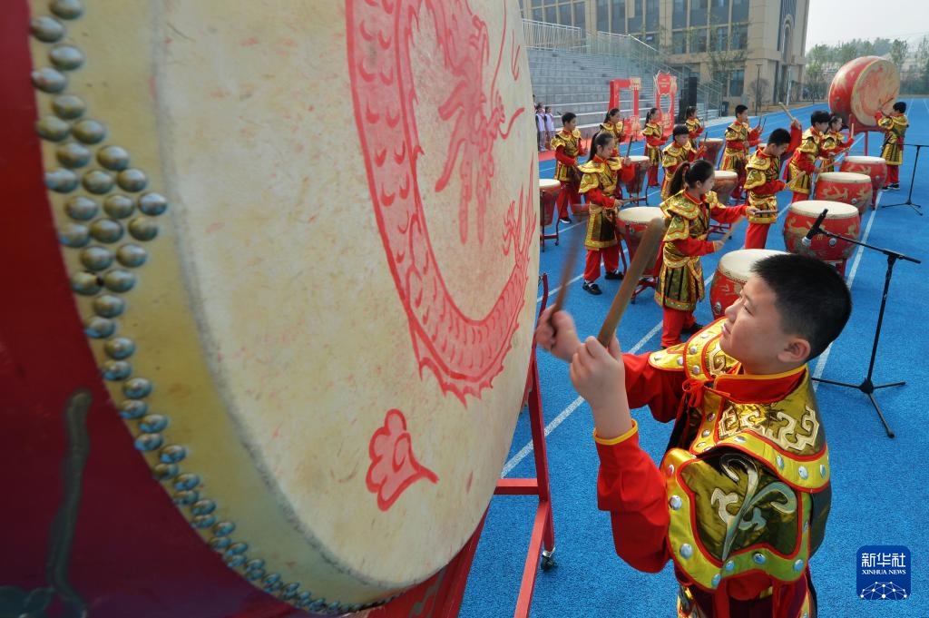 9月29日,在山東青島啟潤實驗學校舉行的迎國慶主題活動中,學生表演鼓舞。